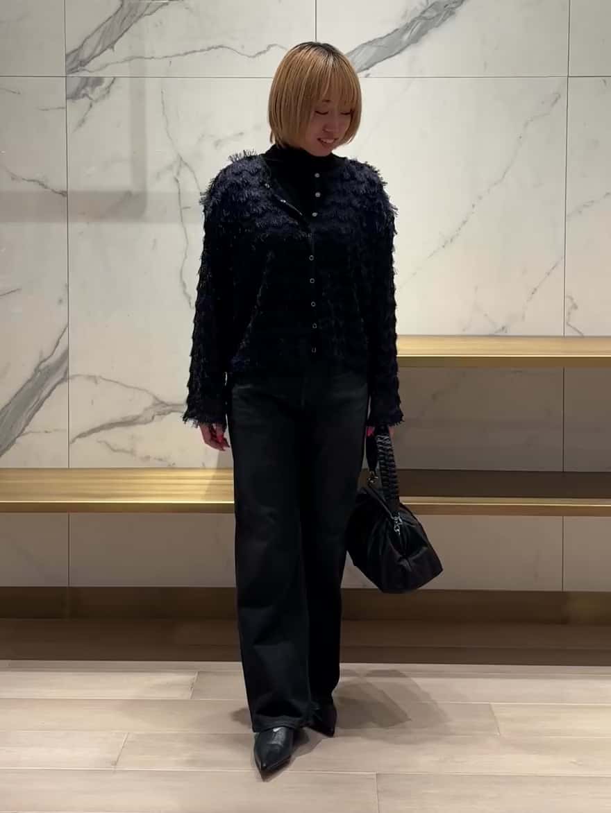 フリンジ素材のネイビートップスは、軽やかな透け感で夏から秋へスイッチできる優秀アイテム。コンパクト丈なので、小柄の方もバランスよく着こなせます。合わせたブラックデニムはヴィンテージ加工で程よいこなれ感があり、シンプルながら大人っぽく仕上がるのがお気に入りです。羽織としてもプルオーバー風にも楽しめる万能トップスと、すっきり見えするデニムの組み合わせは、小柄の方に特におすすめです。