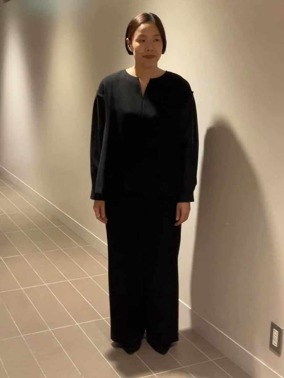 人気の2WAYダブルクロス素材のセットアップです。抜け感のあるTネックブラウスは、裾に向かってふんわり広がるシルエットで女性らしさを演出。透け感のある袖が軽やかさと上品さをプラスします。パンツはワイドシルエットでストンと落ちるラインがきれいに見え、オンオフ問わず活躍。ブラックで統一すると、すっきりモードな印象に仕上がります。