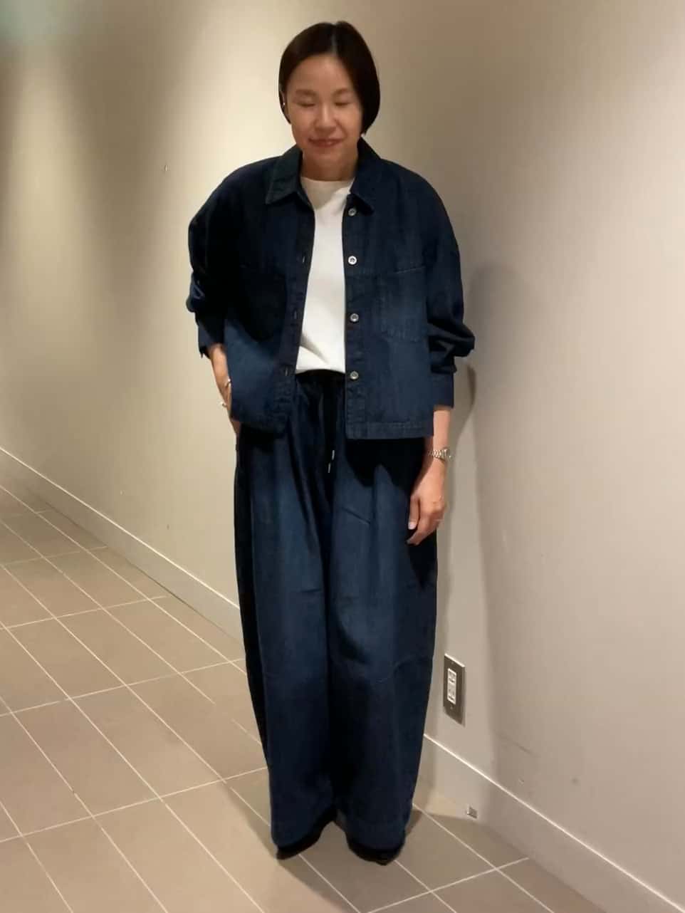 軽く羽織れるコクーンシルエットのデニムブルゾンと、ボリューム感のあるワイドパンツのセットアップ。楽ちんなのに、きちんと見えも叶うので、この時期に大活躍です!