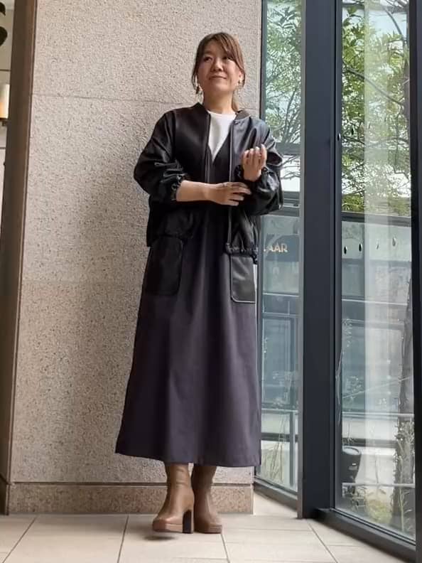 ブラウンのフェイクレザーブルゾンを主役にしたコーデです。ゆったりフォルムと裾のブラウジングで程よい抜け感を演出。ジャンバースカートのサイドスリットが女性らしさをプラス。羽織るだけで上品に仕上がるおすすめスタイルです◎