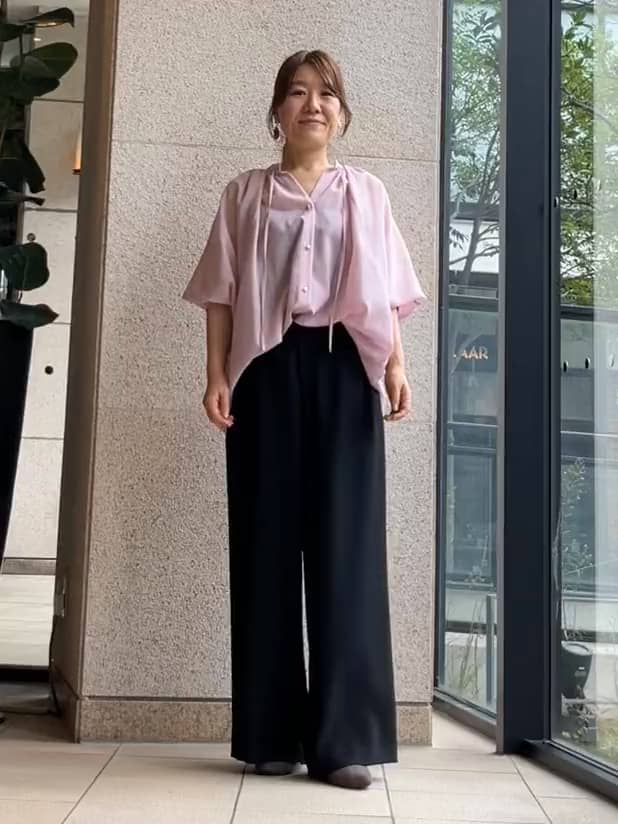 ピンクのシアーブラウスに、ブラックのワイドパンツを合わせたスタイリングです。ブラウスの変形ラグランスリーブと少し長めの着丈で、Iラインシルエットをすっきり演出。軽やかでしなやかなパンツはオンオフどちらも対応できる人気アイテムで、動きやすさときれい見えを両立しています。