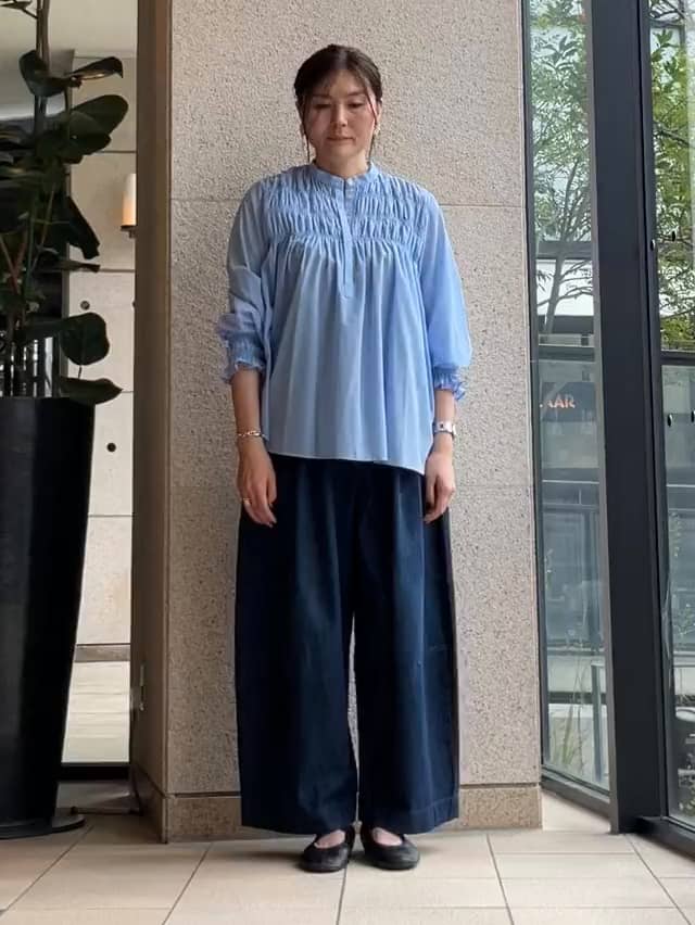 素材の表情が可愛く、袖のフリルもポイント。サックスの色味で軽やかに着られます。新作デニムはウエストドロスト仕様で履きやすく、ボリューム感も今っぽくておすすめです!!