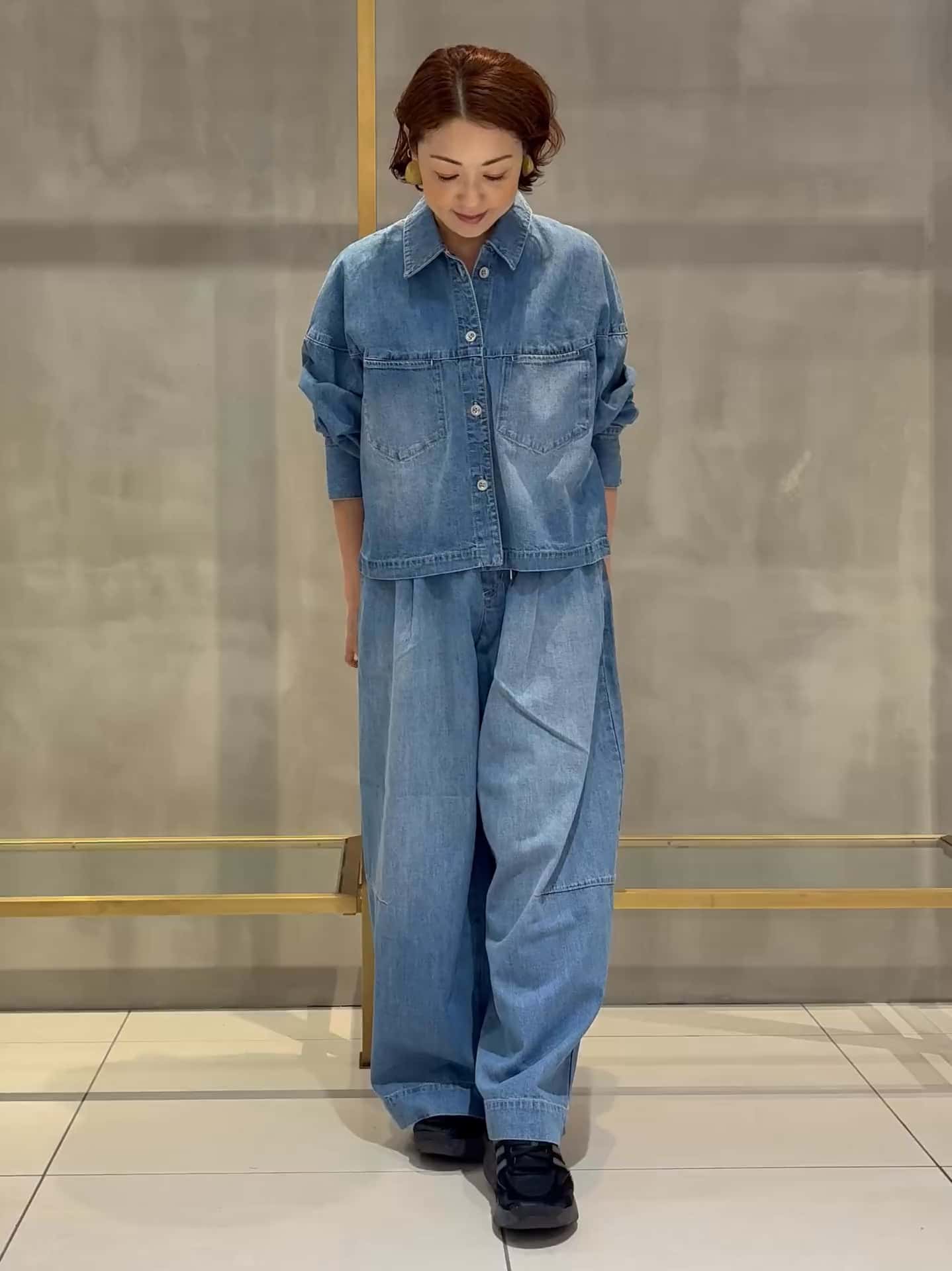 軽やかでシャツ感覚のデニムブルゾンは、コクーンシルエットで羽織るだけで旬の印象に。パンツはウエストドロストで気楽に履けるボリュームワイドシルエット。セットアップでスタイリングしやすく、今の気分にぴったりです。身長154cmで両方1サイズでちょうどいいバランスでした!パンツはデザイン的に大きめなゆったりシルエットです!