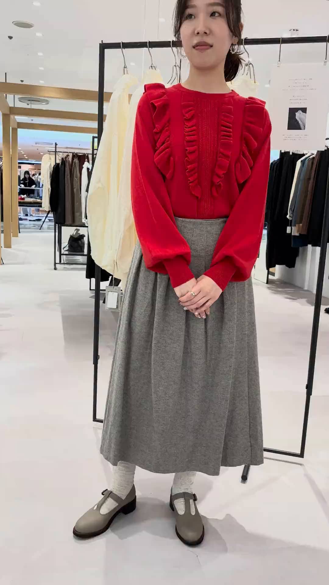 目を引くフリルディテールのニットを主役に、スカート合わせでフェミニンに♡新鮮な短め丈の巻き風スカートには、ストラップシューズやロングブーツで足元のコーディネートも楽しみたいです♫