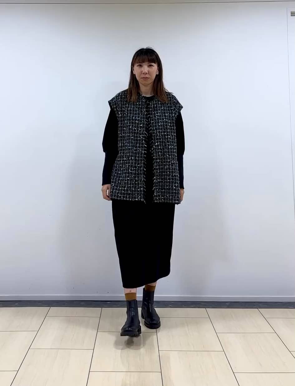 着用感:見た目よりも薄手で柔らかいツイードジレ。