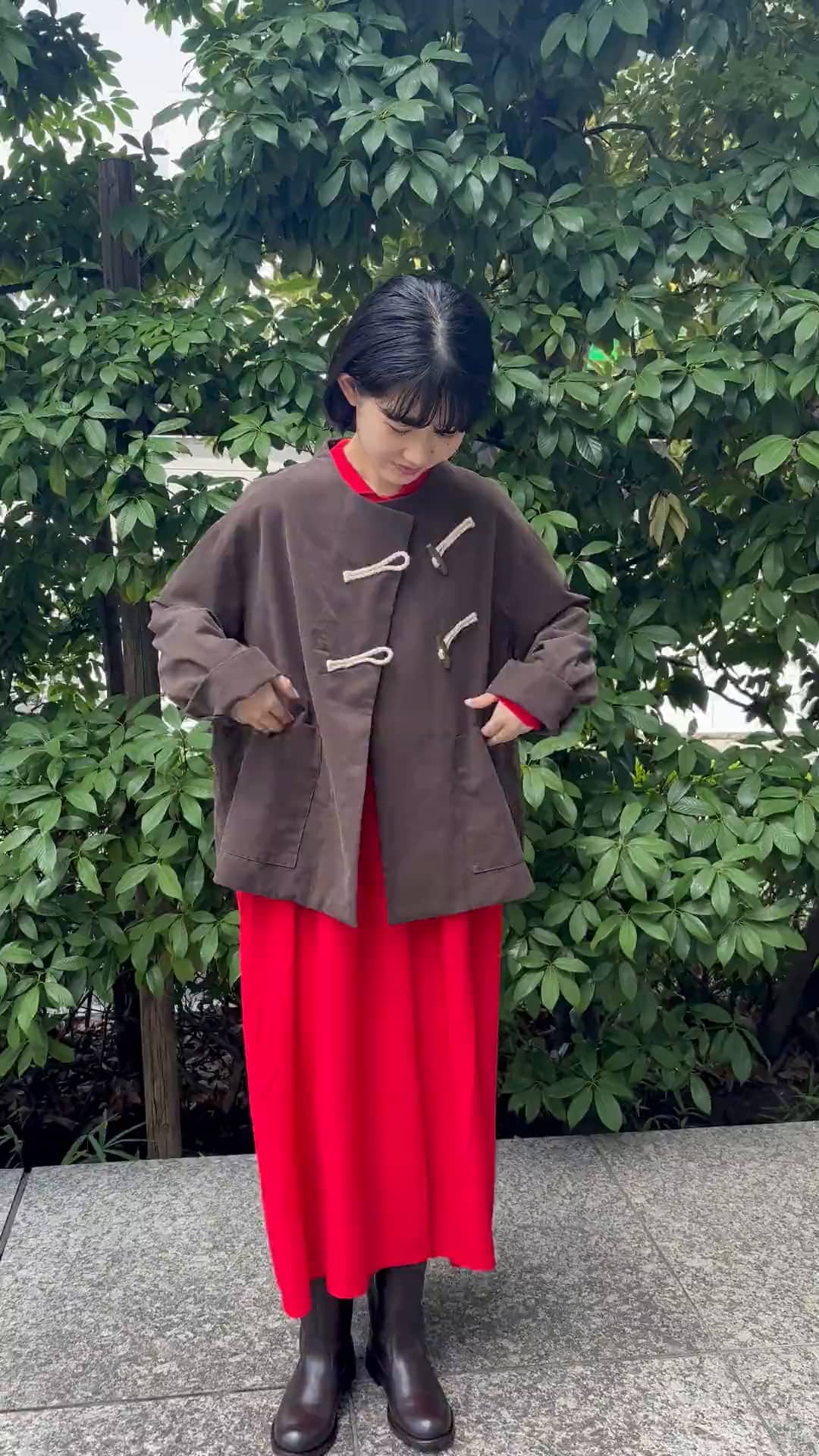 華やかなレッドのニットワンピースにブラウンのジャケットで秋カラー🌰トグル釦のナチュラル感が可愛いです。ニットワンピースは、ニットながら体のラインを拾いすぎず、おすすめです!