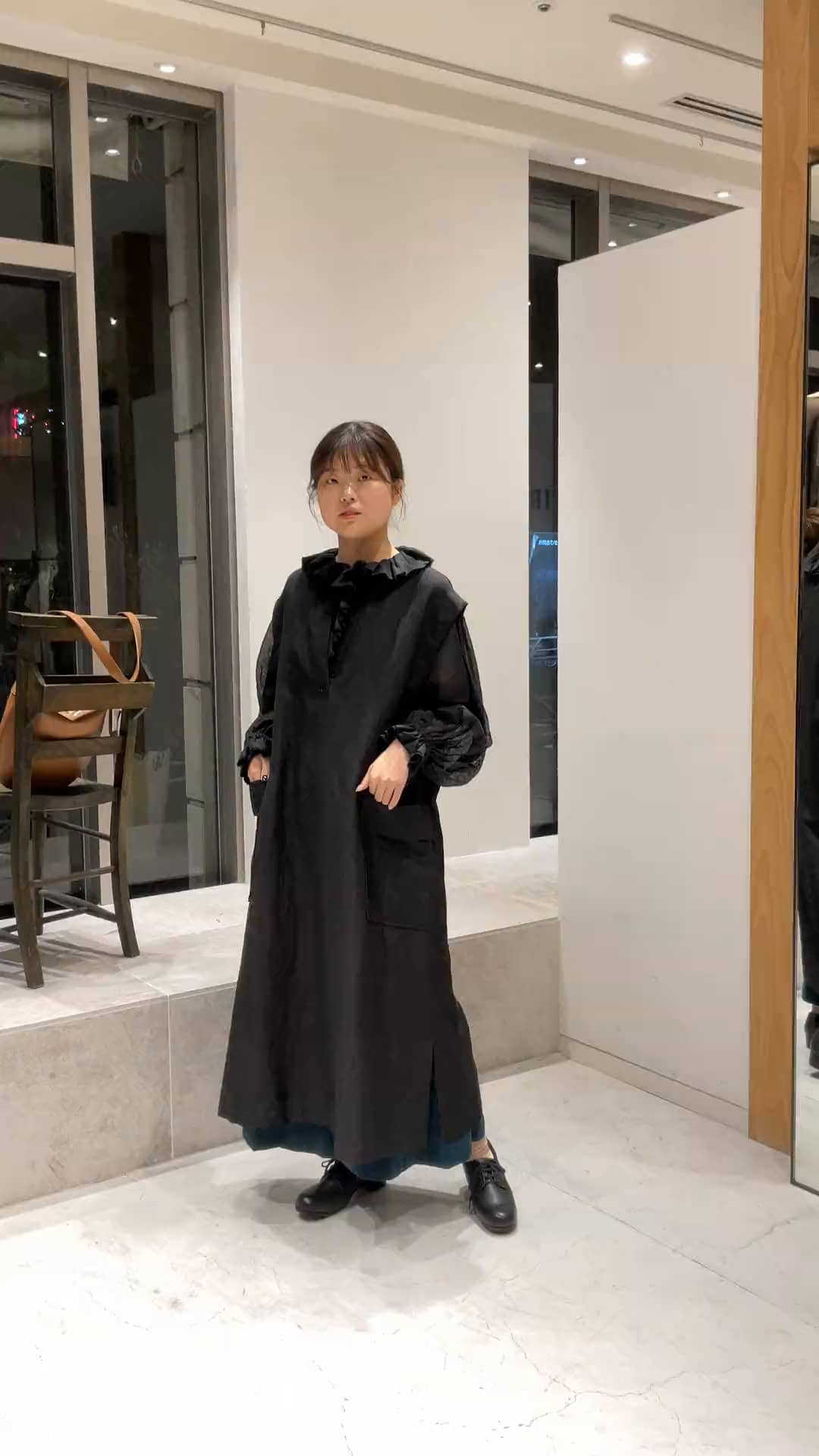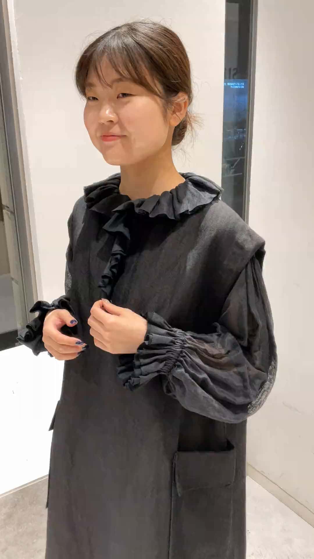 ウールリネンヘリンボーン柄ジャンパースカート。vの切り込みからフリルが覗かせて、黒と素材の透け感を楽しむ。バズしでロワズィールブルーをチラリ🫣