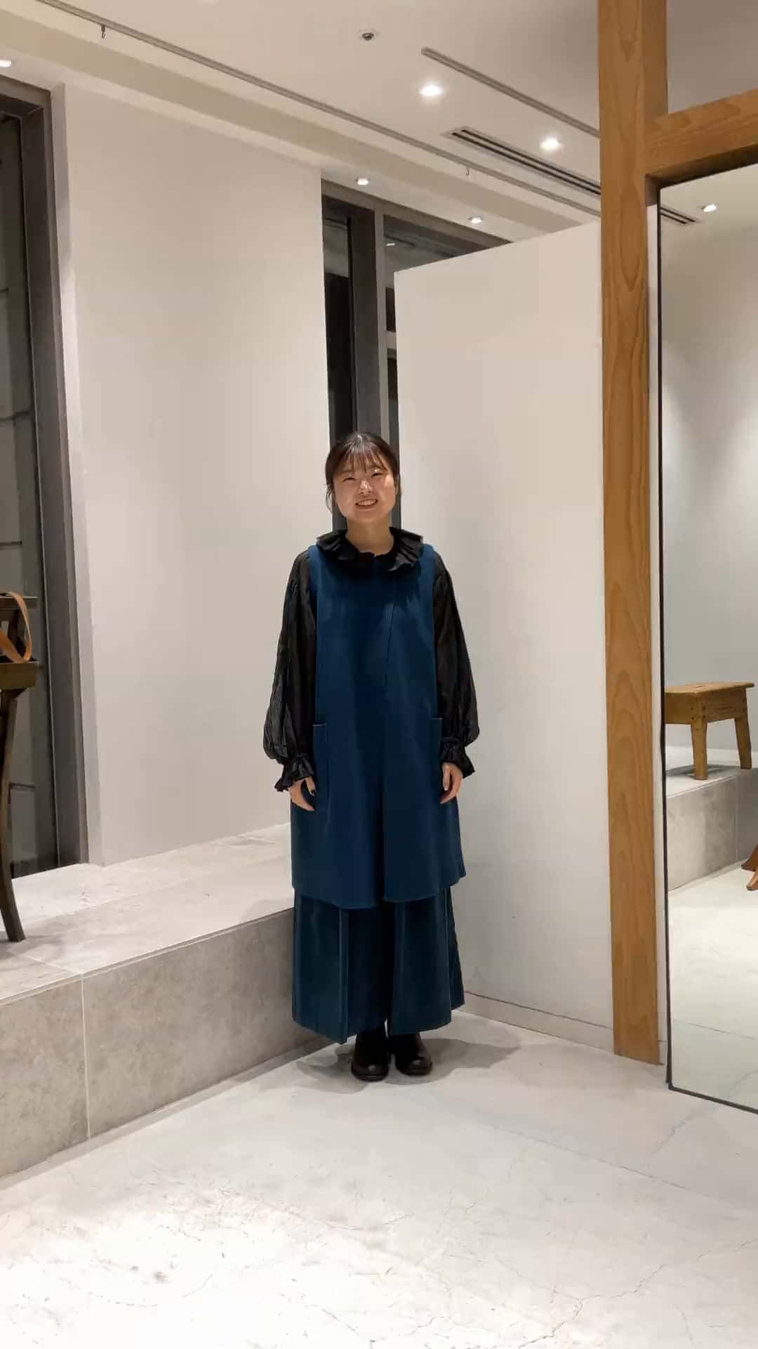 ブルーのセットアップ風。Iライン意識でこの時期の重ね着も重たく見えにくいです◎ロングのベストは綿のニット地で今から長く着られます!