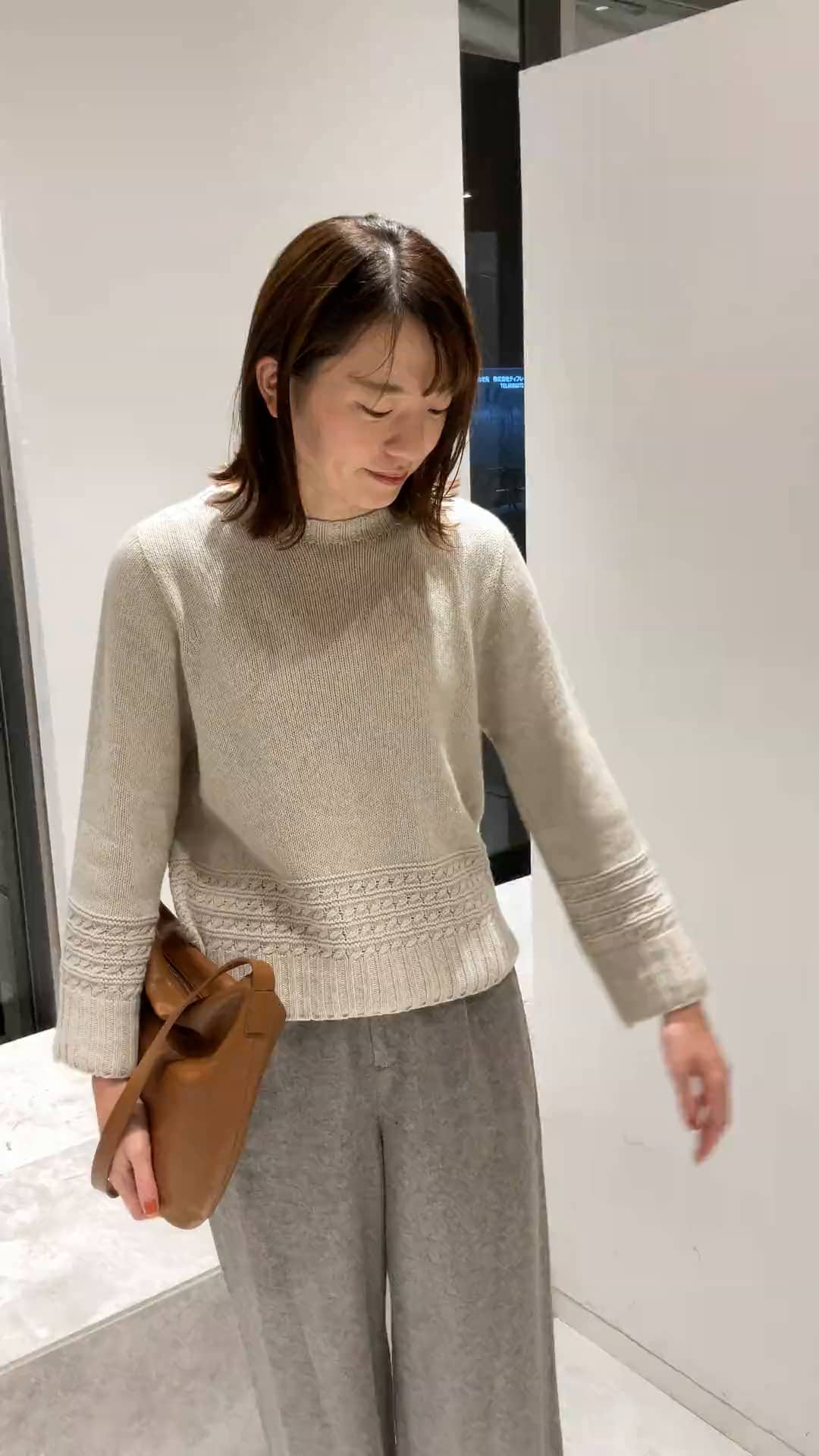ホールガーメントのニットはLOISIR定番素材のウールリネン。地柄がアクセントに。今年もキナリとグレーの2色展開。ストレートのワイドパンツですっきりと秋の着こなしに。