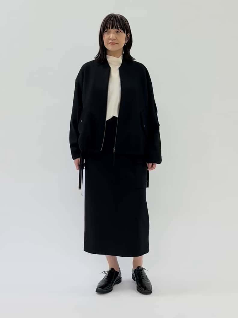 上質ウールジャージーのブルゾンにきれいめカーゴスカートを合わせたセットアップ。柔らかく軽い着心地で、袖口や裾のさりげないデザインが女性らしさをプラス。スカートはストレートラインでバランスよく、ポケットディテールがアクセントになっています。