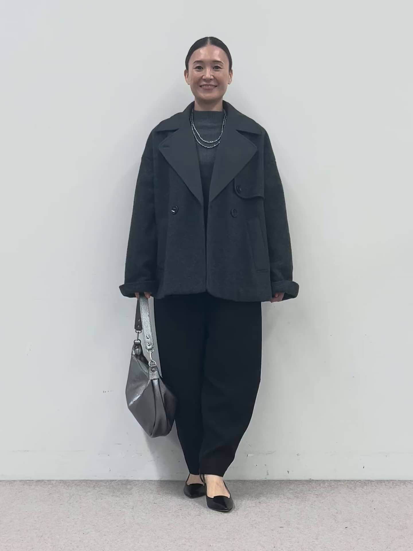チャコールの圧縮コートに、ブラックのバレルパンツを合わせました。コートは軽く温かくボディのふくらみと光沢タフタの切り替えがアクセントに。ショート丈で小柄な私でもバランスよく着られます◎パンツも程よくカジュアルで、コートと合わせて着映えするシルエットです!155cm前後の方はどちらも1サイズでちょうどよく着られると思います。