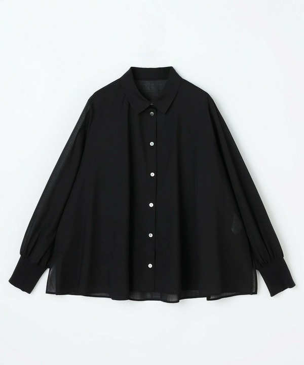 トレンドのウール混シアー素材のブラウスとスカート。透けるほど薄く織りあげているので、気温の高い時期でも最適な着心地です。セットアップでキレイ目にスタイリングしましたが、単品でも使いやすいデザインです。