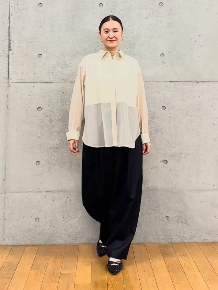 スタイリスト戸野塚かおるさんとのコラボアイテム、ベージュのシャツとネイビーのコクーンパンツを合わせました。シャツはシワになりにくく、オーガンジーの切替でさりげなく女性らしさをプラス。パンツは腰回りゆったりで裾に向かって緩やかに広がるコクーンラインなので、小柄でもバランスよく着こなせます。オンにもオフにも使いやすく、気軽に上品スタイルが楽しめるおすすめコーデです。パンツはボリュームがあるデザインなので小柄の方や痩せ型の方は1サイズでもバランス良さそうです!