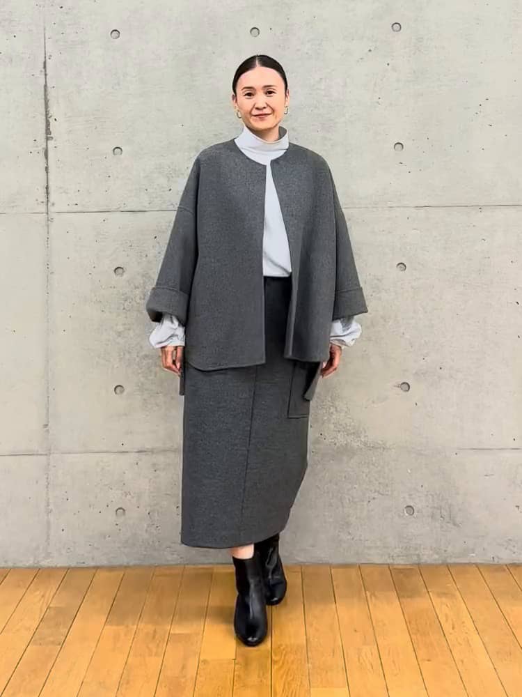スタイリスト戸野塚さんコラボのグレーリバー仕立てハーフコートを主役にした上品スタイル✨