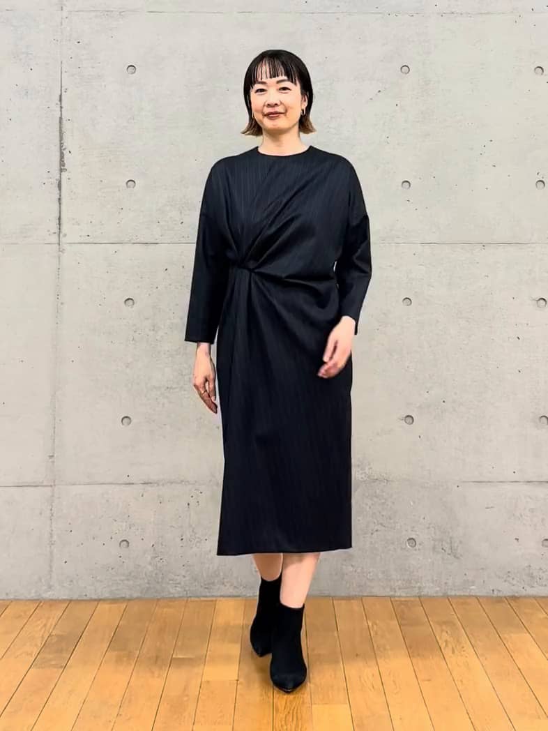 メンズライクなチョークストライプを活かした女性らしいドレープが美しいワンピースです。