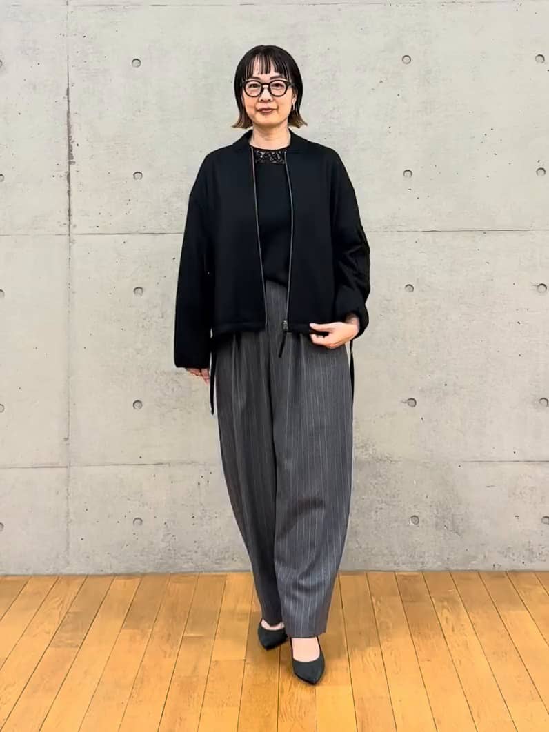 ブラックのブルゾンにグレーのストライプパンツを合わせた、メンズライクなスタイルです✨