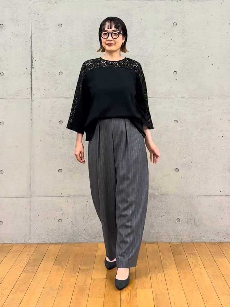 ブラックのレースコンビトップスにグレーのストライプパンツを合わせ、大人の女性らしいモードスタイルに仕上げました。