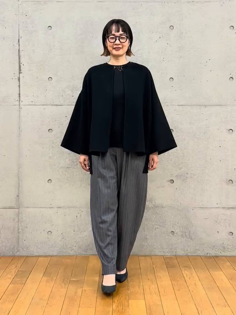 スタイリスト戸野塚さんコラボのブラックリバーコートを主役に、トップスもブラックで統一。グレーストライプのパンツで軽やかさをプラスしたモードスタイルです✨