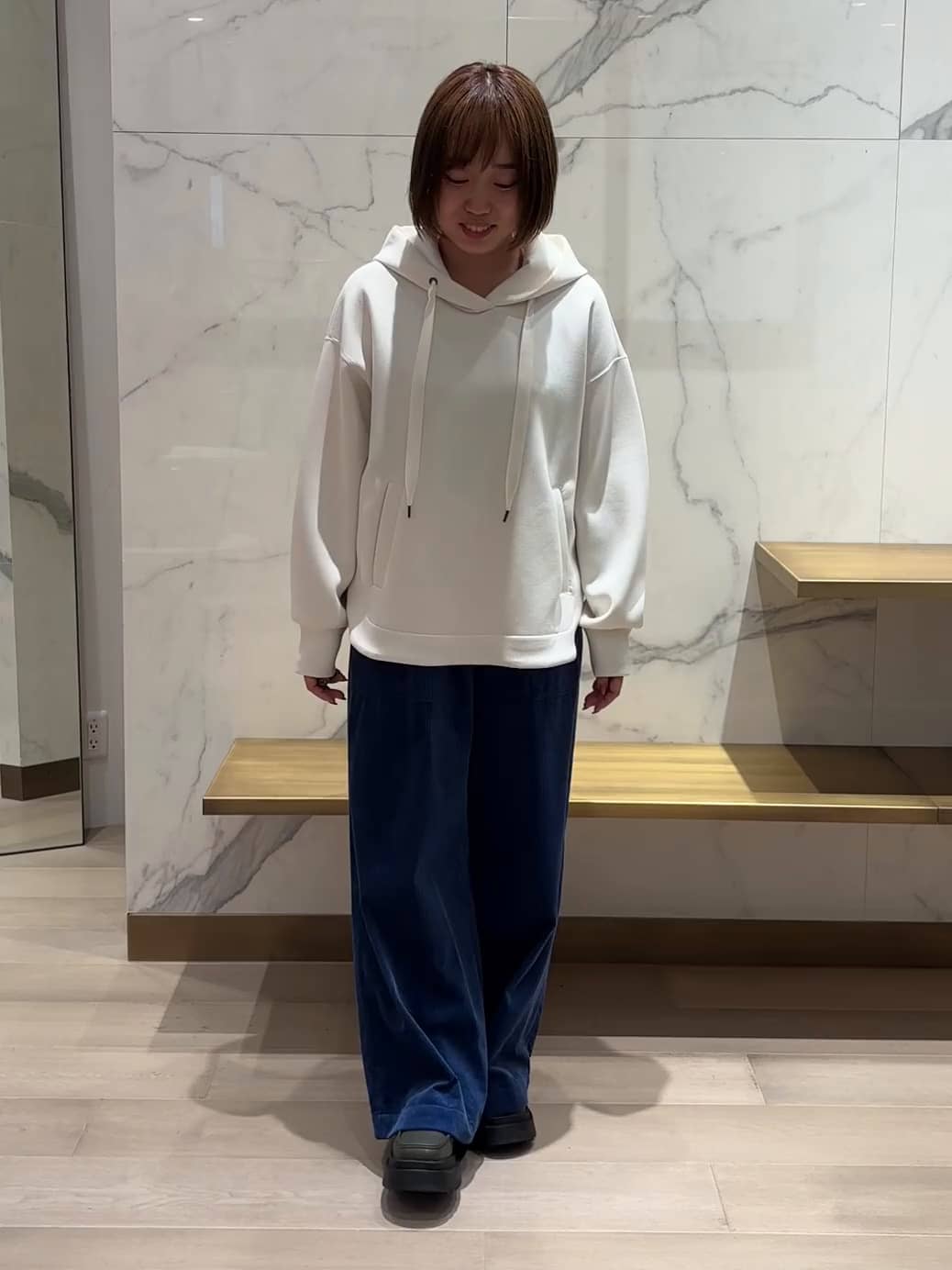 軽くて膨らみのあるホワイトパーカーは、大きめフードとリボンで顔まわりが華やかに✨ 短め丈だから小柄でもバランスよく着られます。ブルーのコールパンツは楽ちんだけどきれいめで、パーカーと合わせてもだらしなく見えません。