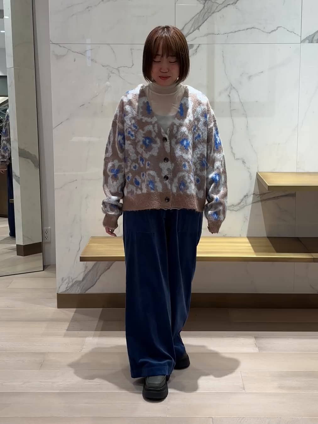 毛足のあるモヘア混ジャガードのカーディガンに、メッシュのハイネックインナーをインして抜け感をプラス✨ 短め丈なのでブルーのコーデュロイパンツとバランスが取りやすく、小柄な方でもすっきり着こなせます。シンプルなのに着映えする、大人カジュアルなスタイルです。
