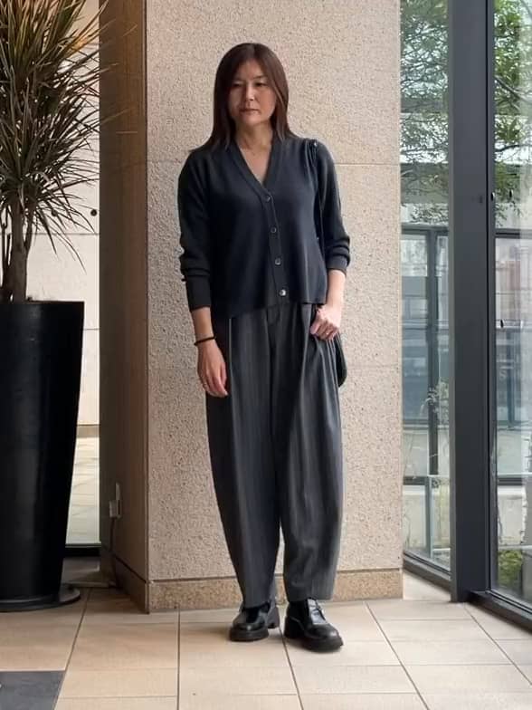 グレーのカーディガンとグレーストライプのコクーンパンツで、落ち着きのあるモードスタイルに。カーディガンは軽さと暖かさを兼ね備え、三角パーツと前後差のある丈感でボトムとのバランスがきれいに決まります。パンツは程よいゆとりとストレッチで、履き心地も抜群です。カーディガンは深すぎないVネックで女性らしい着こなしが叶います◎