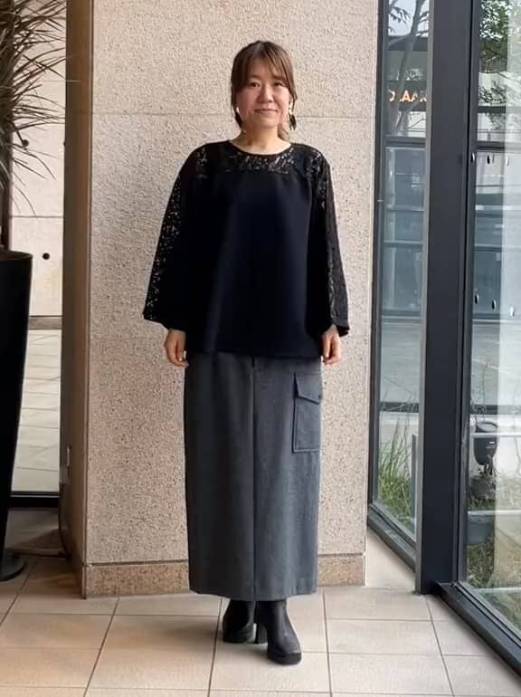 スタイリスト戸野塚さんとのコラボシリーズ。トップスは、軽くハリのあるダンボール素材で立体感を演出。デコルテから袖にかけたレースがアクセントになり、甘くなりすぎず華やかな印象に。グレーのカーゴスカートを合わせて、きちんと感とカジュアル感を程よくミックスしました。