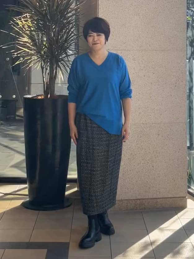 深すぎないVネックで女性らしいネックラインと発色の良いブルーがお顔を美しく見せてくれます。