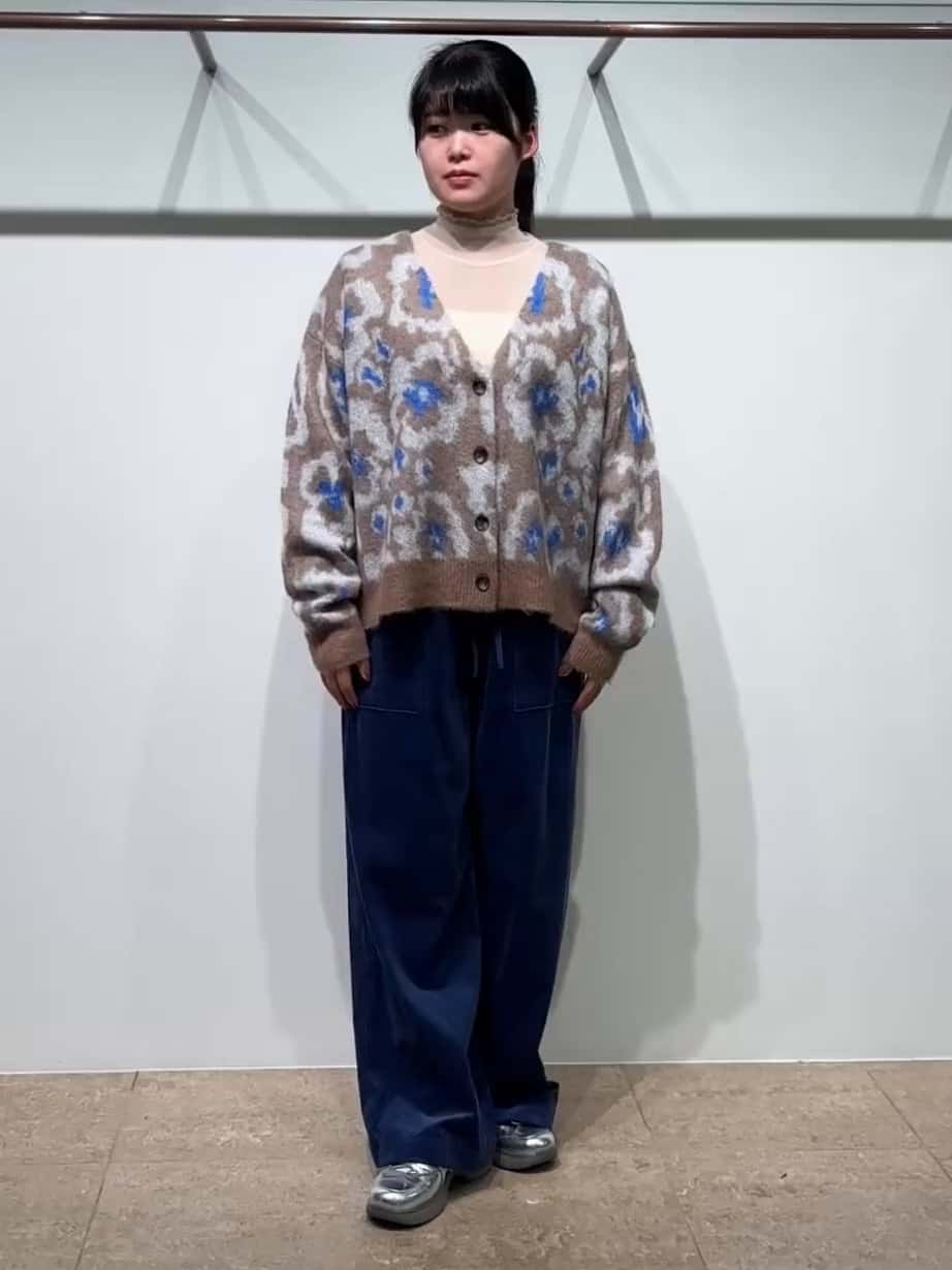 柄の色に合わせてコーデュロイのブルーのパンツを合わせた上品でカジュアルになりすぎないコーディネートです。