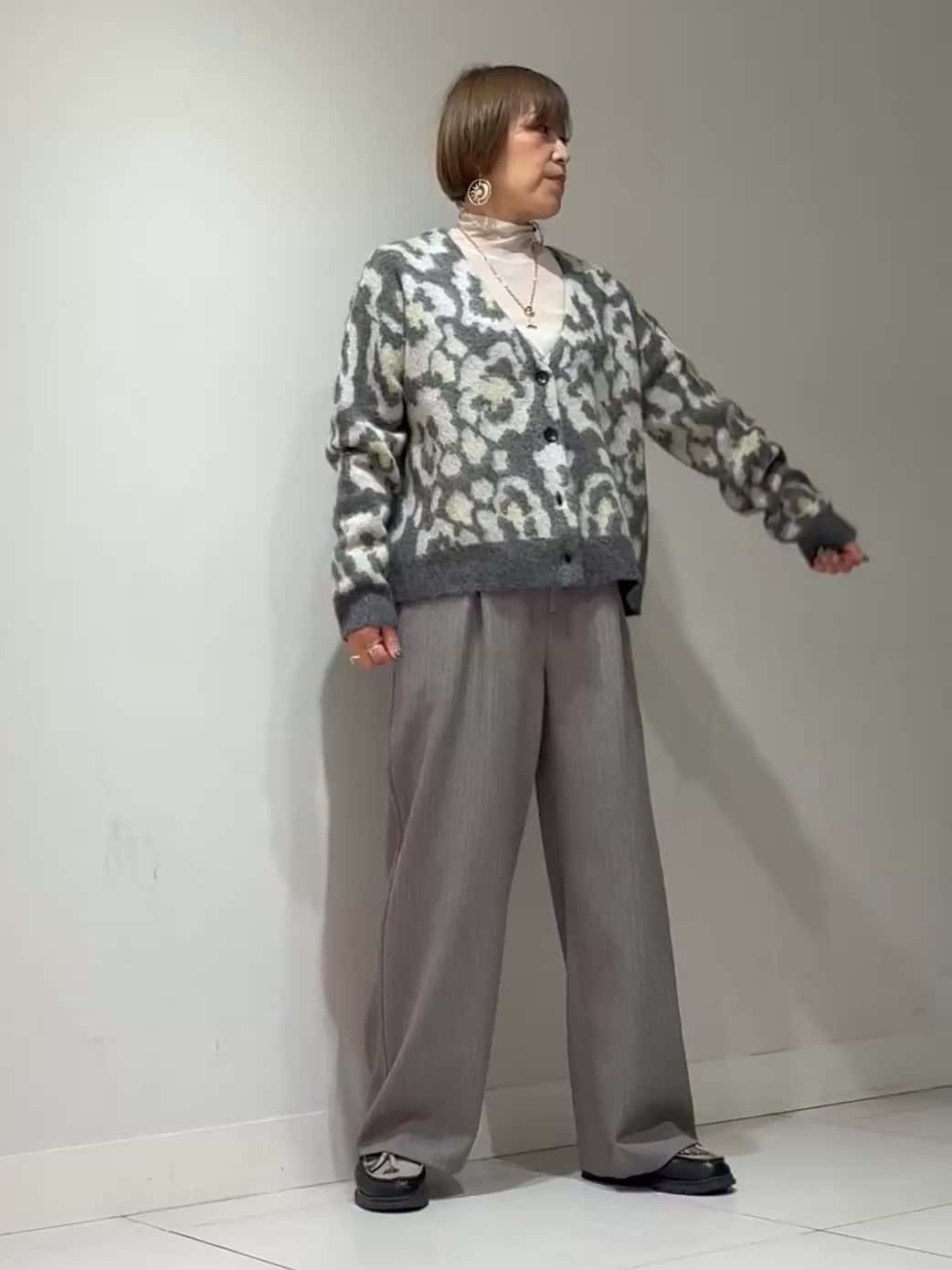 ブラックカーディガンは毛足のあるモヘア混素材で、ふわっとした温かみと柔らかさが魅力。抽象的なオリジナル花柄ジャガードで、立体感のある表情がコーディネートのアクセントになります。短めの丈感なので、ハイウエストのワイドパンツやスカートと合わせるとバランス良く着こなせます◎