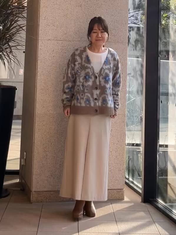 毛足のあるモヘア混素材のジャガード柄カーディガンは、抽象的な花柄が上品で表情豊か。短丈なのでワイドパンツやスカートとも相性抜群です。後ろゴムでリラックス感のあるライトベージュのマーメイドスカートで女性らしさをプラス。カーディガンはさらっと羽織るだけで着映えする一枚です。