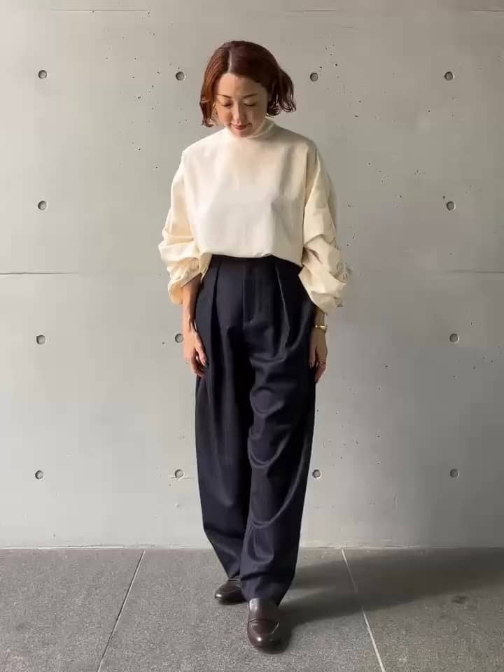 シルキーな光沢のブラウスは肩から袖にギャザーシャーリング入りで、ふんわり優しいフォルム。ハイネックで顔まわりもすっきり。今回は全部インして、すっきり着こなしました。腰回りゆったり、裾に向かってコクーンラインのネイビーパンツは動きやすくマニッシュな印象。
