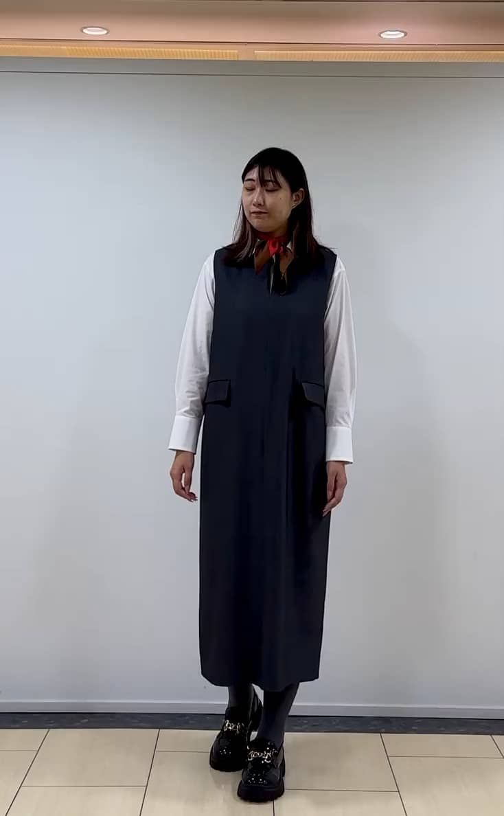 着用感:身体のラインを拾わないゆとり感と顔まわりをすっきり見せてくれるキーネックデザインもワンピース。合わせるインナー次第でシーズン長くお使いいただけます。