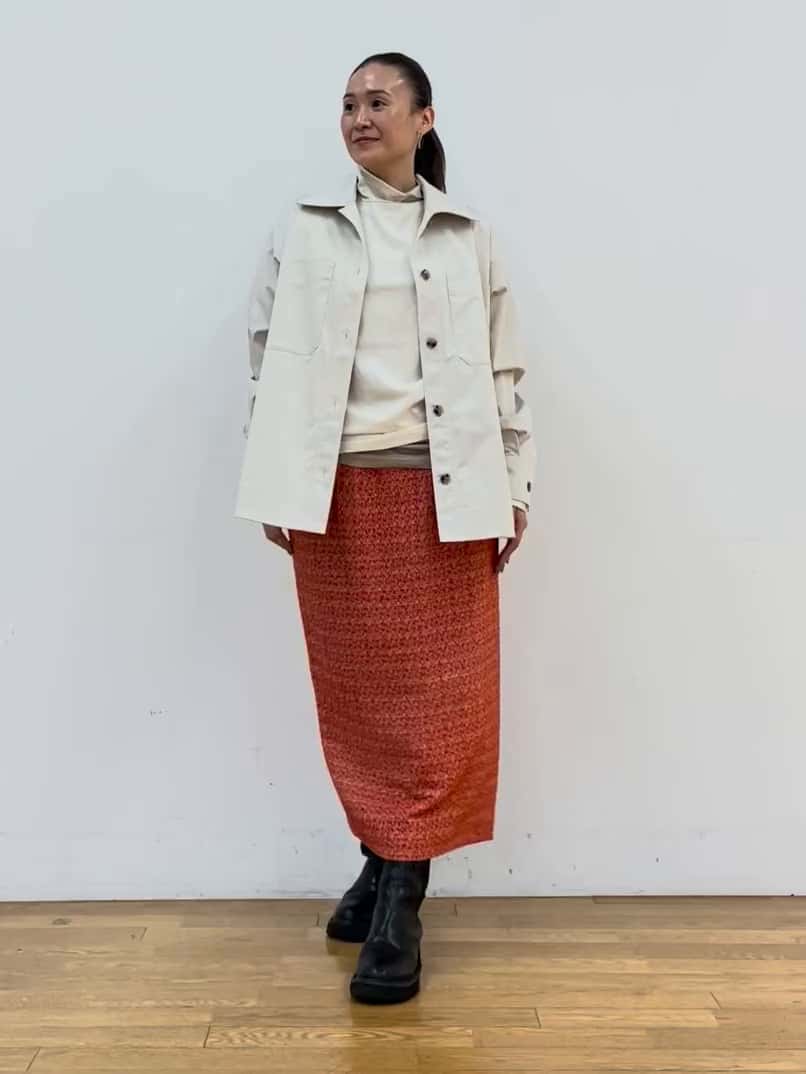 赤のスカートで冬コーデに華やかさをプラス。