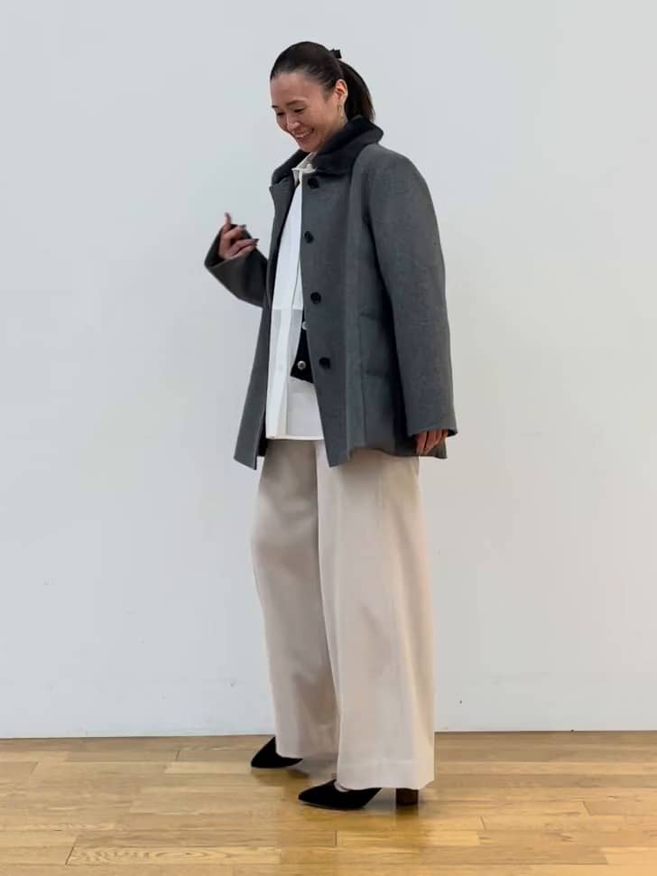 身頃のサイドはタフタの切替で軽さと動きやすさを両立。グレーの落ち着いた色味なので、どんなインナーやボトムにも合わせやすく、ワードローブの主役になる一枚です。
