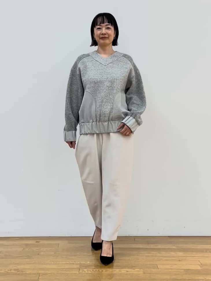 トップスは、裏毛ボディ×ウールパイルの袖・ヨーク、タフタのポケットや裾と異素材ミックスで立体感&奥行きのあるデザイン。ファスナーやポケットのアクセントでスポーティな雰囲気も出せます。グレーの落ち着いた色味ながら、フォルムの膨らみが着映えポイント。