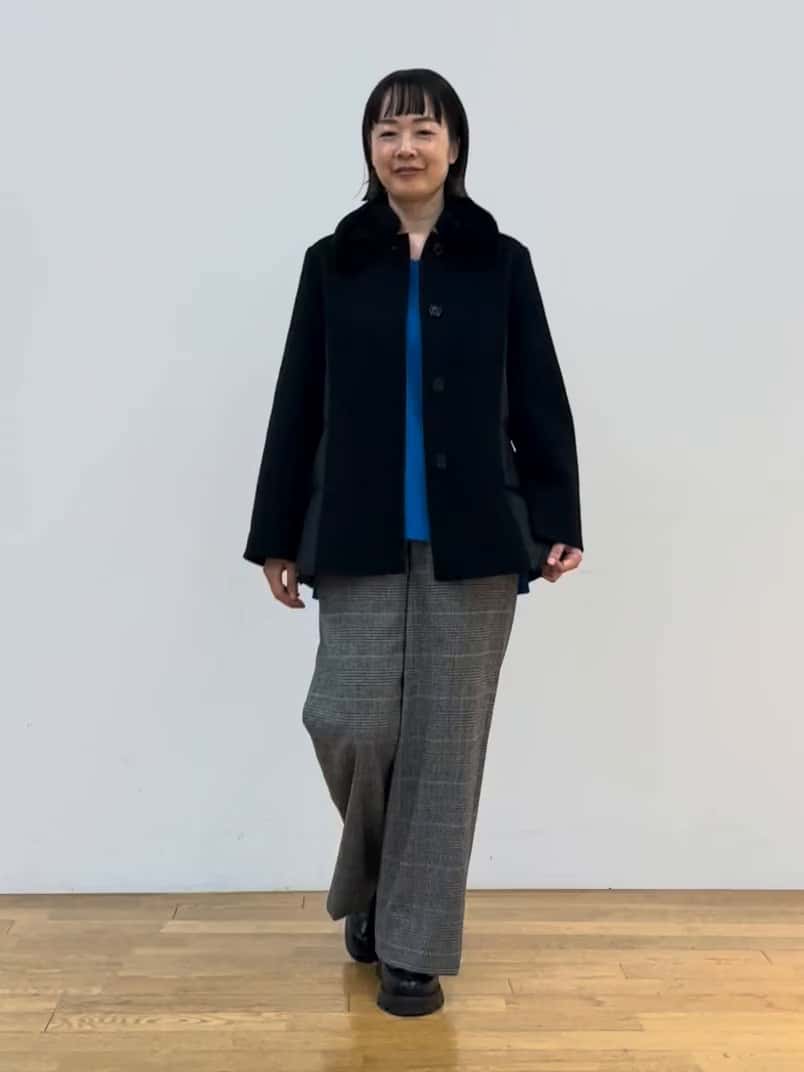 パンツは秋冬定番のワイドタイプ。ゴムウエストで履きやすく、センタープレスで脚長見えも。ヒールでオフィススタイル、スニーカーでカジュアルに、と幅広く着回せます。ブラックコートにチェックパンツでコントラストを効かせたバランスも◎