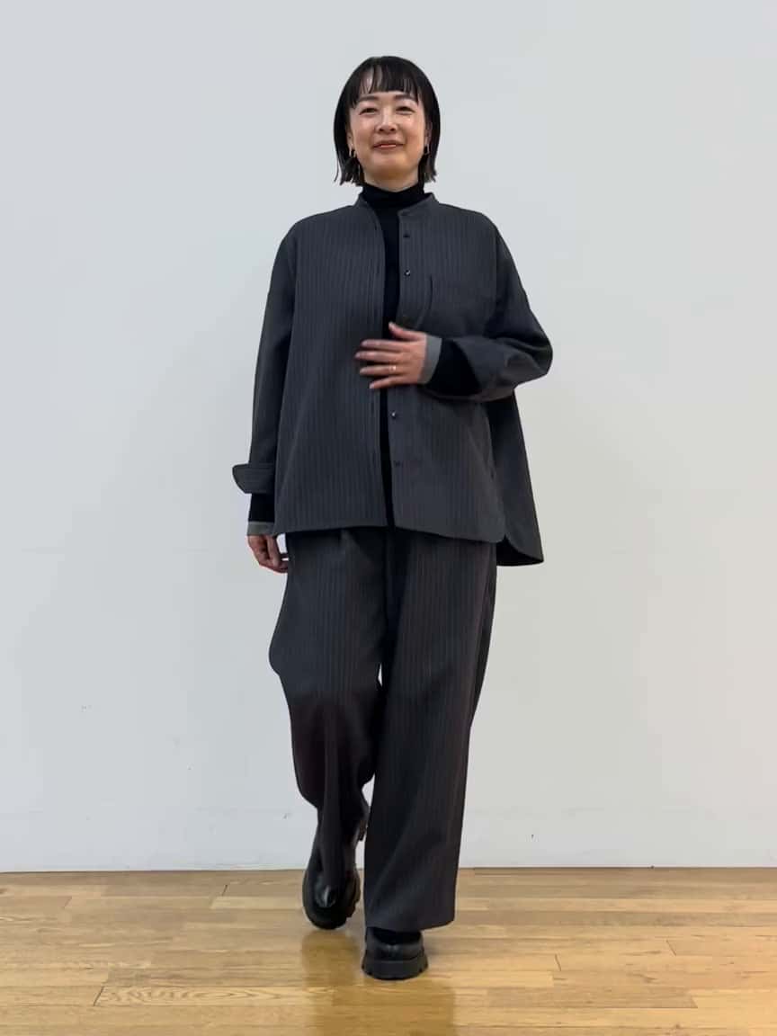 チャコールのウールライクストライプセットアップに、ブラック×グレーの配色インナーを合わせたシックなスタイル。