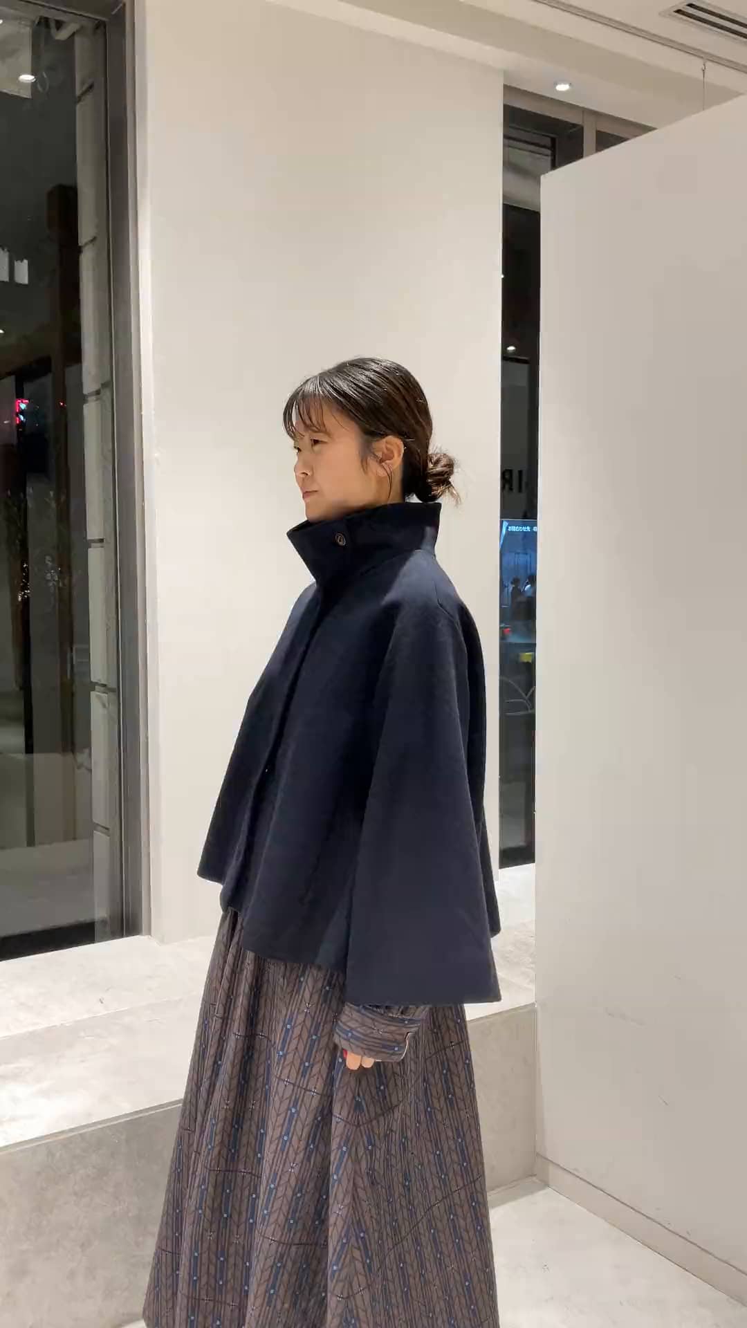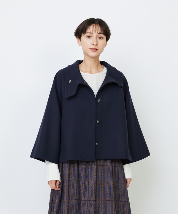 ケープ風のコートは落ち感がきれいで起毛していなくてマットな質感が大人な印象です。