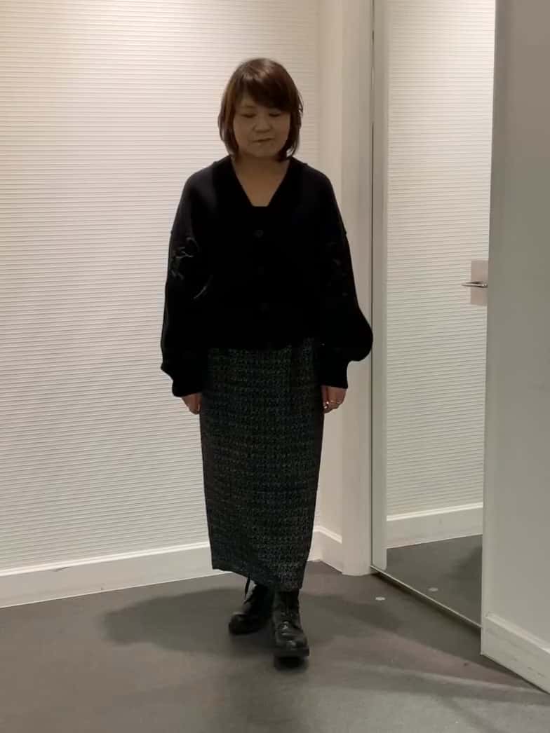 上下ブラックでまとめると、落ち着きつつも素材の表情が際立つスタイリングです。