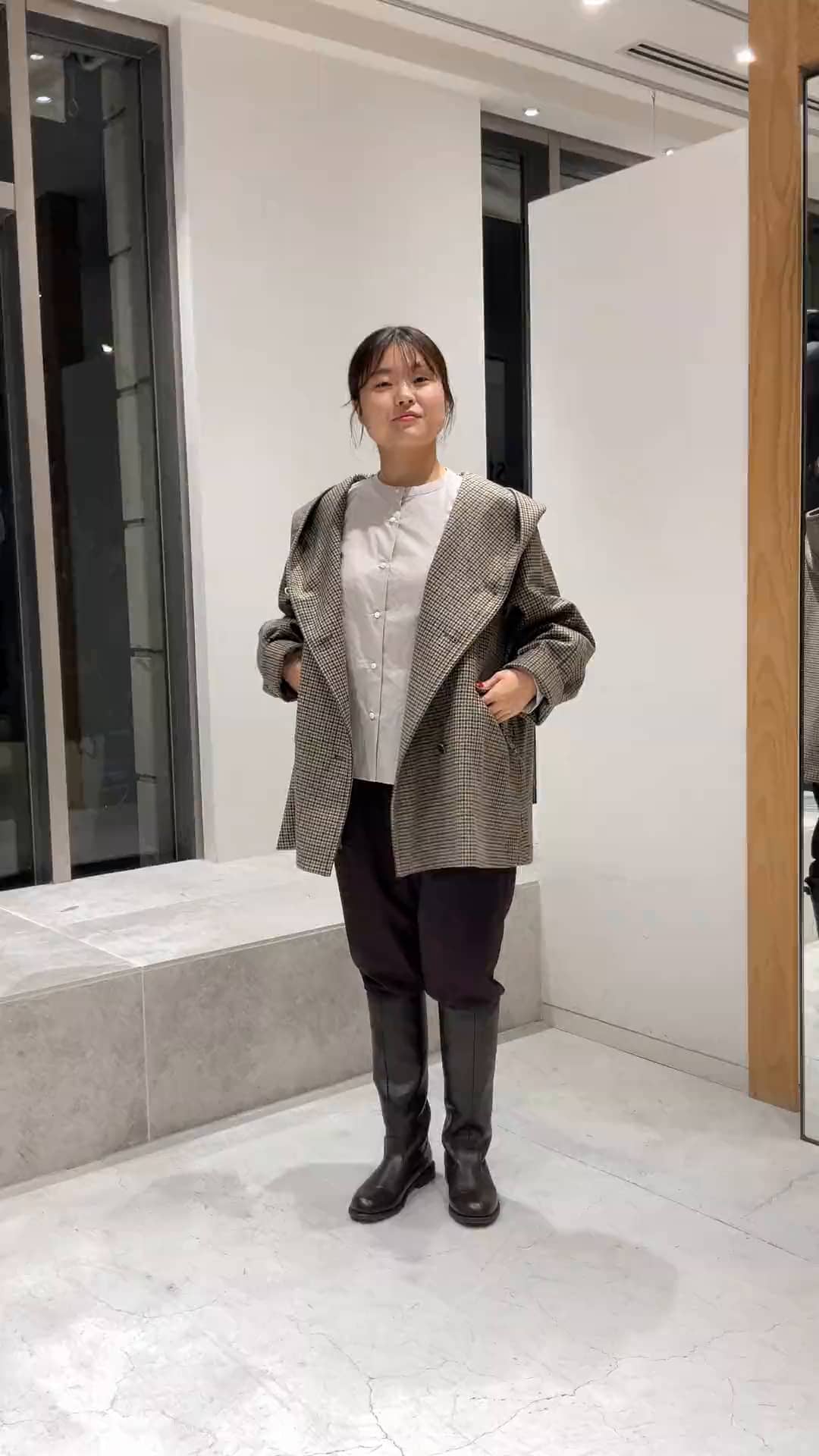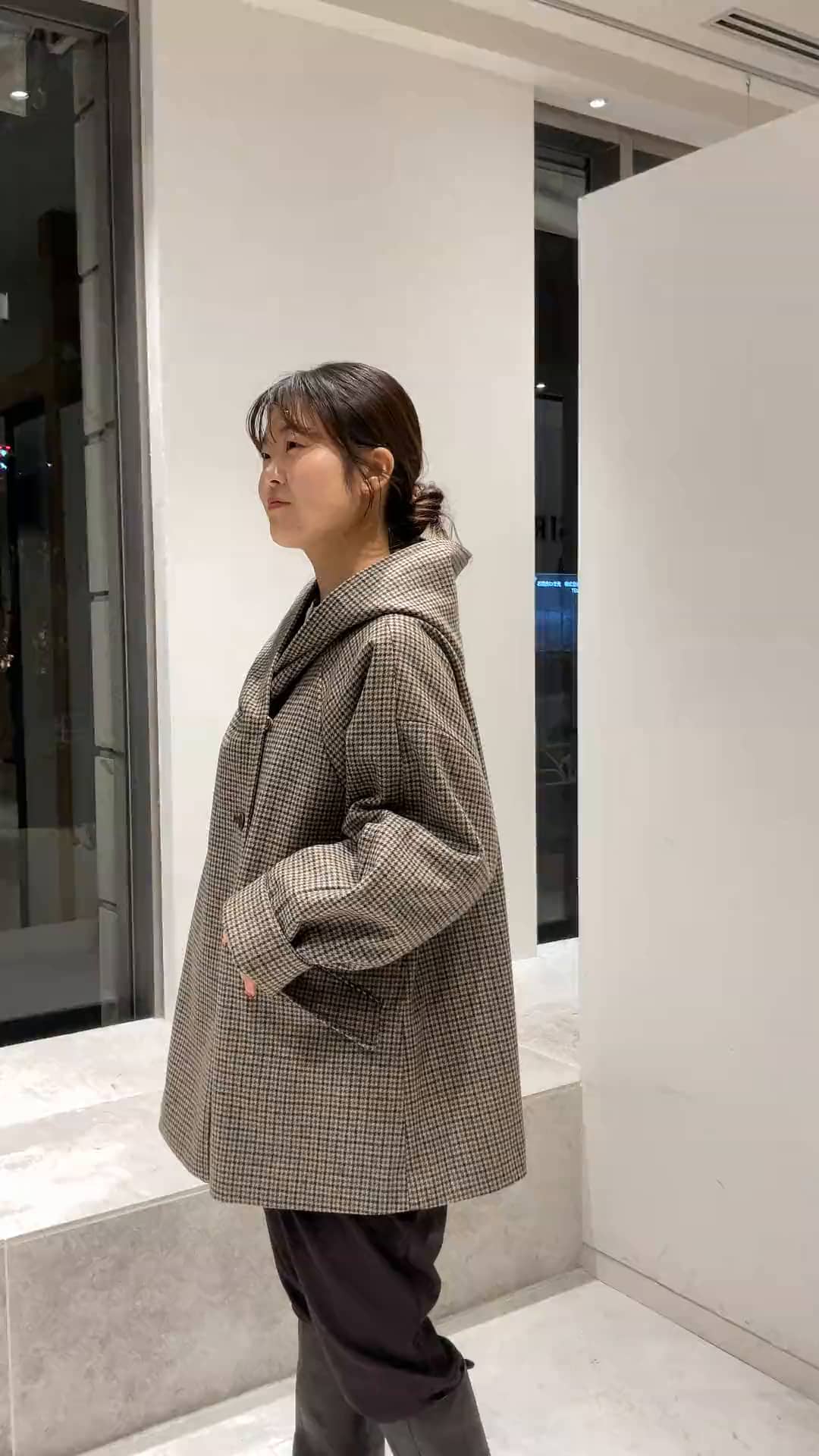 ガンクラブチェックの季節がきました🤎ルーズに着ても、ボタンを留めてバチっと着ても、フードのシルエットがきれいでお洒落見えするコートです。形や丈感、重さも総じて普段使いにおすすめです◎