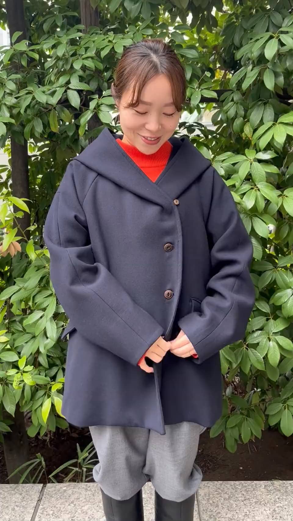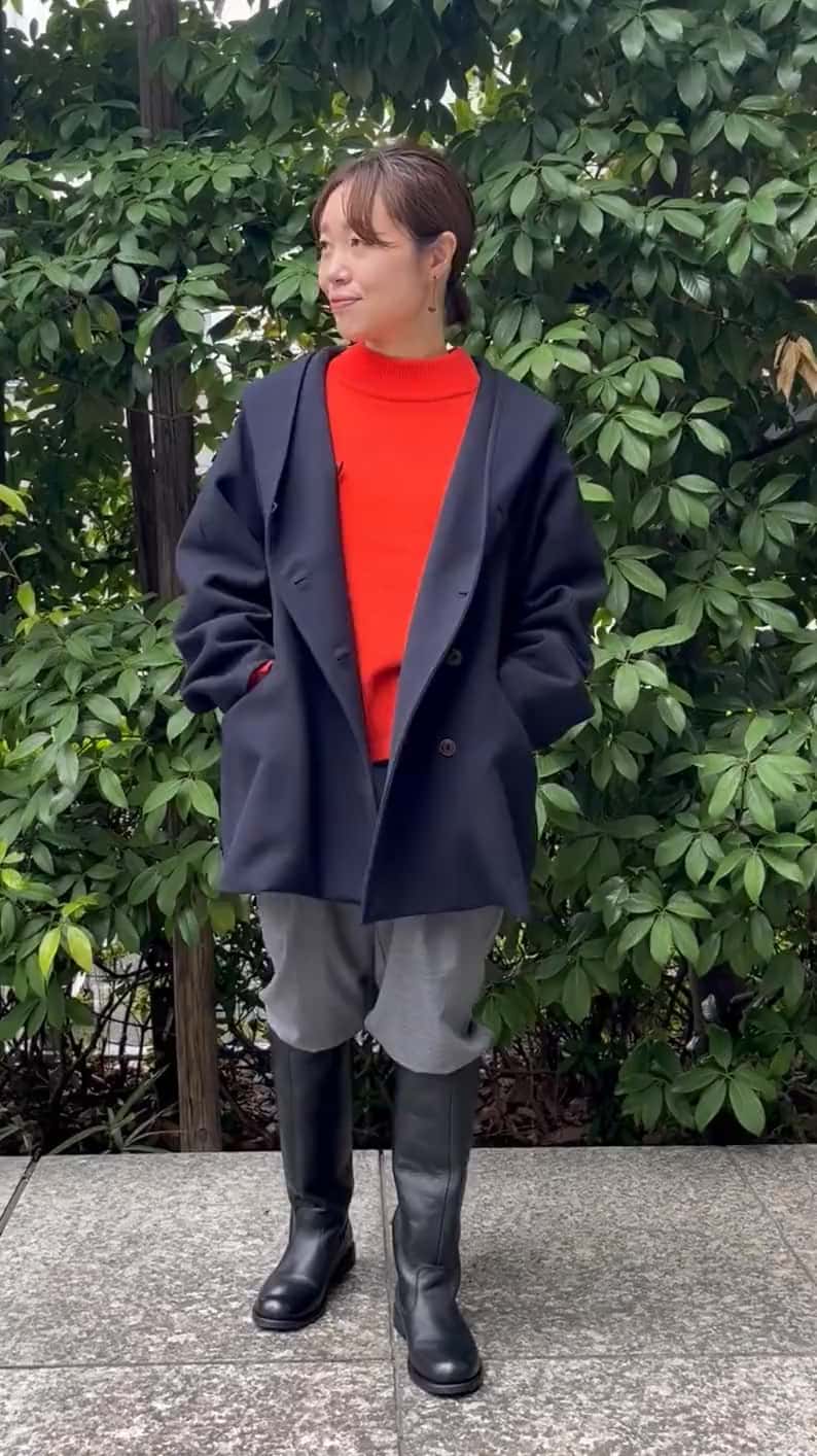 大きなフードがポイントのコートはストレッチ性のある程よい肉厚のウールポリエステル。