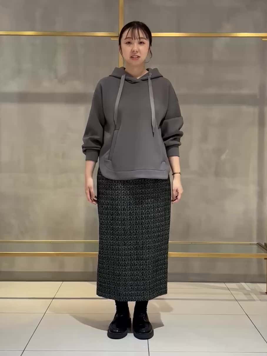 モカのフードトップスにブラックのツイードスカートを合わせた、大人カジュアルなスタイリング。