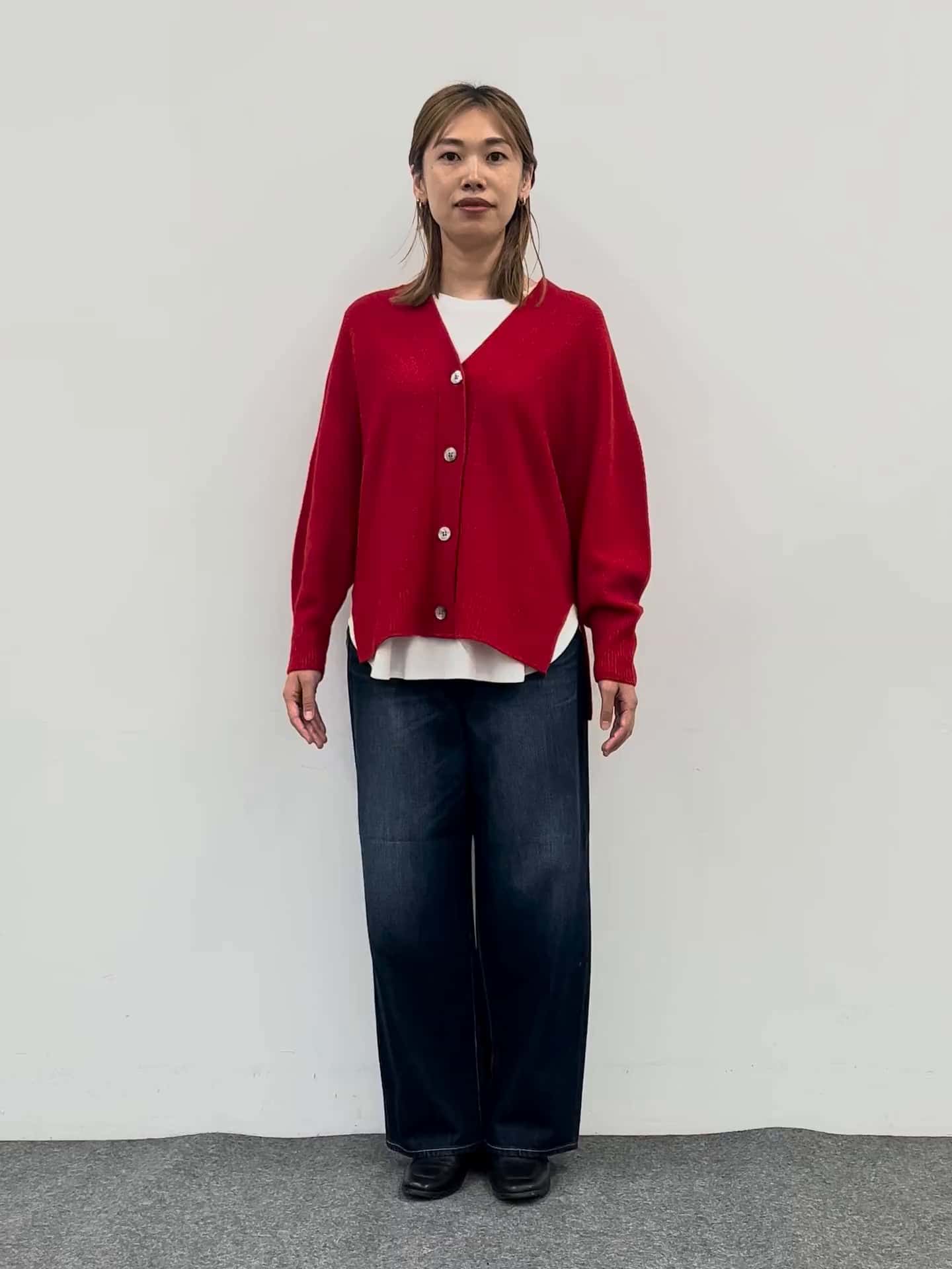 鹿の子編みカーディガンは立体感があって表情豊かな1着てす。Vネックと太めリブでスッキリ見せながら、ゆったりシルエットでインナーを選ばず着回せます。デニムはジャストウエストのワイドシルエットで、コンパクトトップスやブラウスをインしてもバランス◎赤カーデが主役のメリハリのあるカジュアルスタイルです!