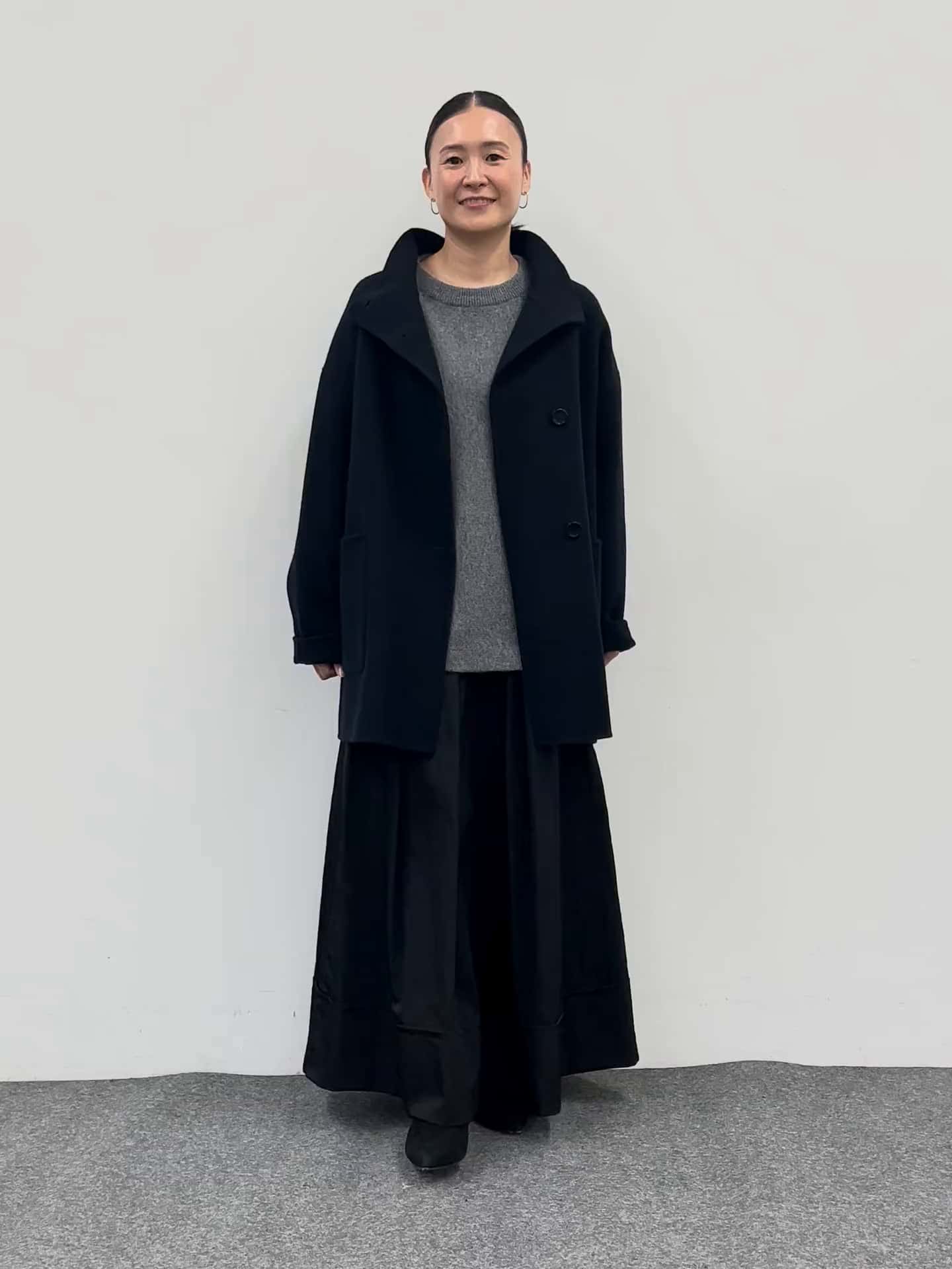 ゆったりシルエットで羽織りやすく、返り衿やリバー仕立ての美しいラインが女性らしくエレガントなミドルコート。軽く暖かく、普段使いからきちんと感のあるスタイルまで幅広く活躍します。身長155cmの私でもヒップがすっぽり隠れる丈で安心感があります。ボリュームボトムともバランスよく着こなせました。