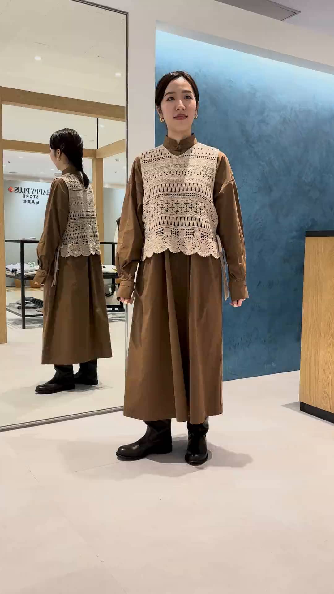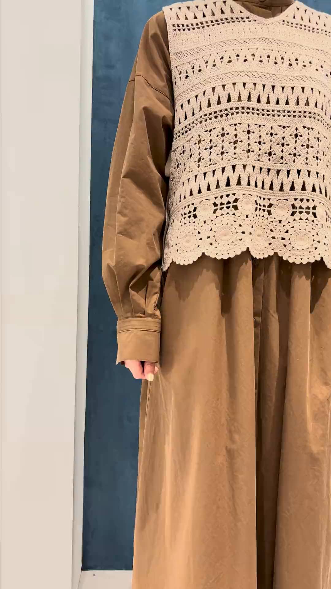 シンプルなシャツワンピースに、レース編みベストをon🪡♡ブラウン系でまとめた、フェミニンな秋コーデです🍂