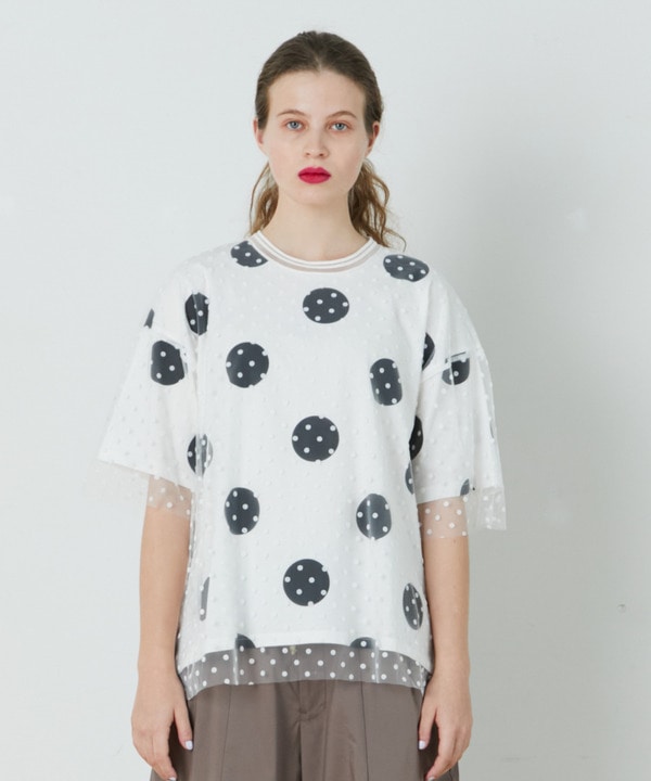 ボーダー柄のカットソー素材の上に、繊細な見え方のするドットチュールを重ねあわせて衿くりでつなぎ合わせたエアリー感とシアーな表情が可愛いカットソー。