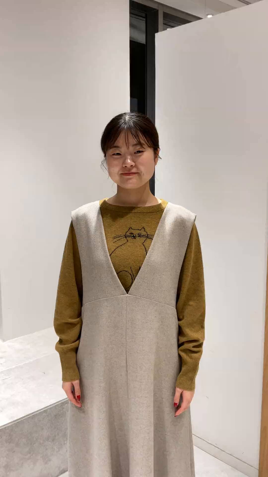 V開きから覗くおすましネコがかわいいです♪秋冬のトーンで大人フェミニンコーデ。ジャンパースカートはフレアラインがきれいで、よく見るとマルチカラーな生地の表情も上品なのでおすすめです。