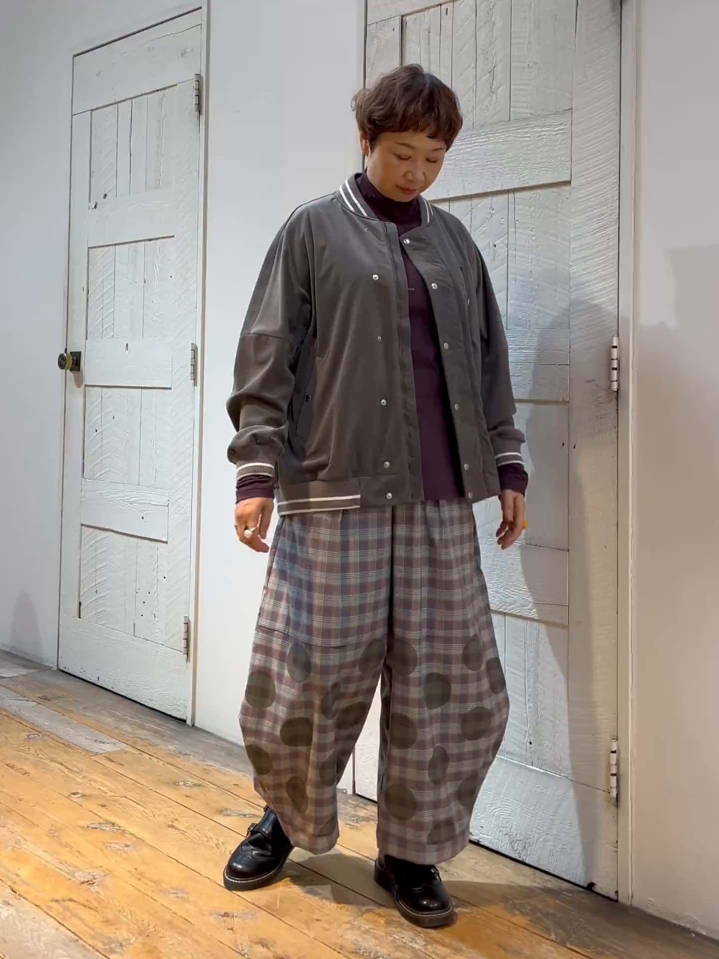 着用感 : ハリのあるポリエステル素材で、シワになりにくいバルーンシルエットパンツ。