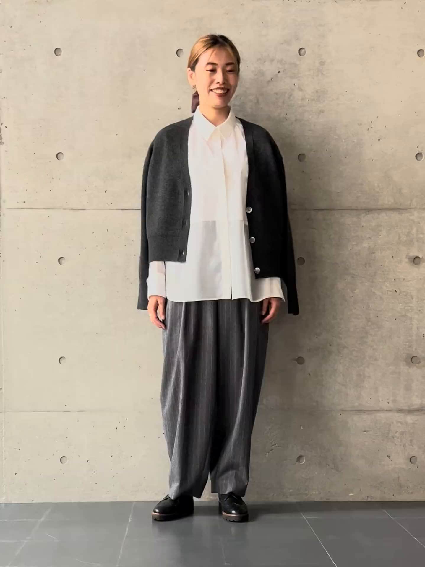 グレーのコクーンパンツで全体をトーン合わせし、抜け感のある大人のモノトーンコーデが