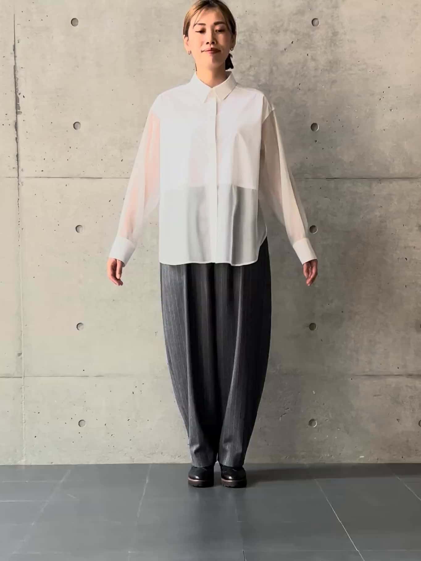 コクーンシルエットのパンツを合わせて、抜け感のある大人のモードスタイルにしました。